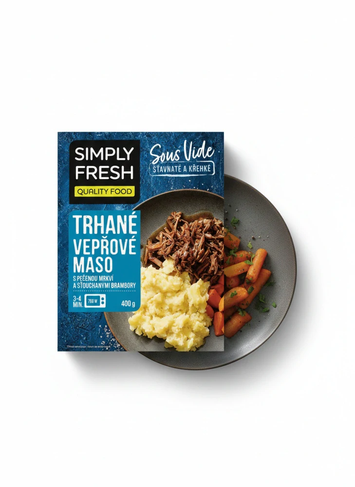 Trhané vepřové maso s pečenou mrkví a šťouchanými brambory 400gSkladem119,0 Kč/ ks
